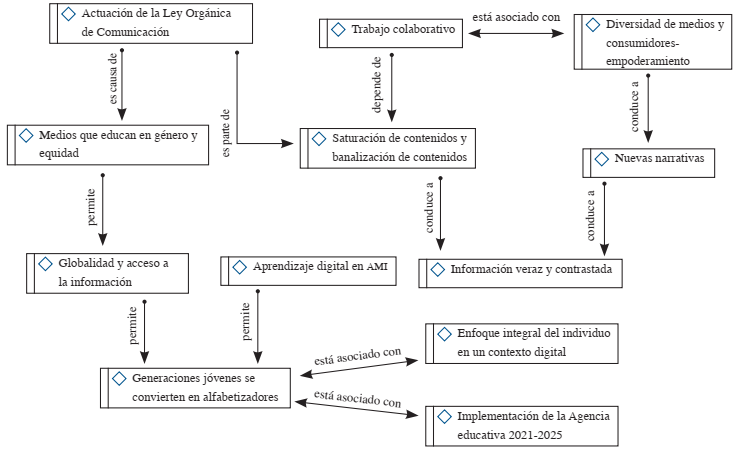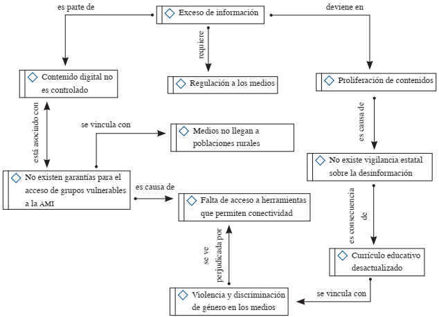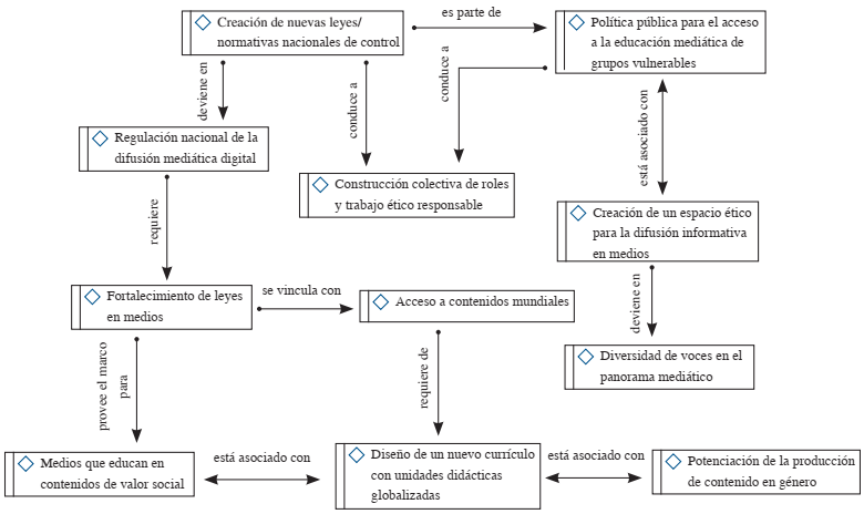 En esta misma línea, Cerny (2022) y Norman et al. (2022) apuntan a que la brecha digital provoca que los estudiantes vulnerables se vean aún más desplazados digitalmente. Si bien se cuenta con estatutos gubernamentales vinculados a la AMI, carecen de la socialización necesaria para entender sus alcances (Mateus, 2021); muchos de los procesos se centran en los patrones de uso, experiencia y adquisición de información gubernamental de los ciudadanos a través de diversos medios digitales (Yavetz & Aharony, 2022). Los participantes consideran fundamental la estructuración de una política pública integral que contemple a la AMI como parte del contexto mediático-informacional-tecnológico (DiGiacomo et al., 2023), pues la evaluación de políticas es clave para garantizar su alcance y efectividad (Rojas-Estrada et al., 2023).