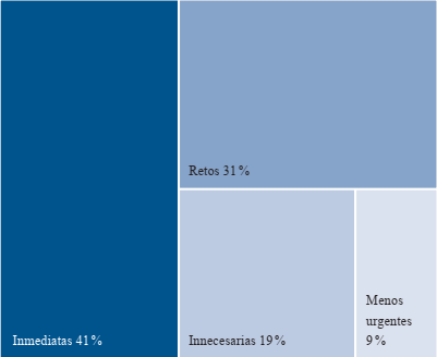 Los lineamientos relevantes entre las mesas de diálogo responden a las acciones que los participantes encuentran como prioridad en este proceso. Las acciones inmediatas y los retos alcanzan el 41 % y 31 %, respectivamente, y se convierten, a criterio de las mesas, en los aspectos que merecen una atención prioritaria y un seguimiento constante para garantizar su correcta implementación y resolución. No obstante, entre el 9 % y 19 % se encuentran las ideas socializadas por los participantes que corresponden a acciones innecesarias o menos urgentes, es decir, aquellos lineamientos que no constituyen una priorización de ejecución.