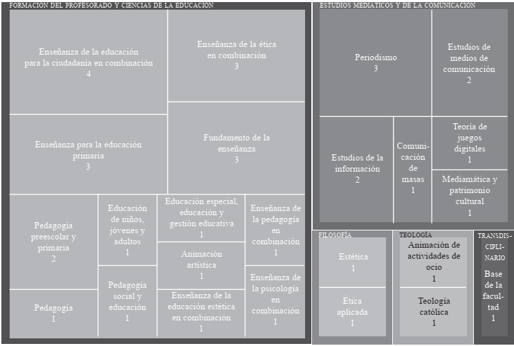 Dentro de un único programa de estudios: predominan los programas centrados en la Formación del Profesorado y Ciencias de la Educación, así como en los Estudios Mediáticos y de la Comunicación. Además, la asignatura se imparte como parte de las disciplinas de Filosofía (Estética, Ética Aplicada - Peritaje Ético y Consultoría Ética) y Teología (Animación de Actividades de Ocio y Teología Católica).