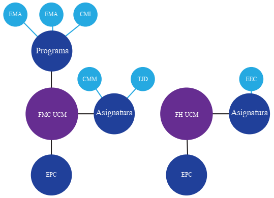 Los estudios de Periodismo, por su parte, ofrecen la asignatura optativa obligatoria “Alfabetización Mediática” a nivel de grado. La Facultad de Pedagogía integra además la asignatura “Educación Mediática y Ciberamenazas” como optativa obligatoria en los primeros cursos del grado en la Educación Especial, Educación y Gestión Educativa (para estudios externos), y en el tercer año del mismo grado en el Fundamento Pedagógico Psicológico y de Ciencias Sociales de la Enseñanza de la Pedagogía y Enseñanza de la Psicología combinadas (asignatura optativa obligatoria u obligatoria) (Figura 5).
