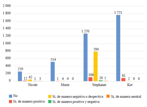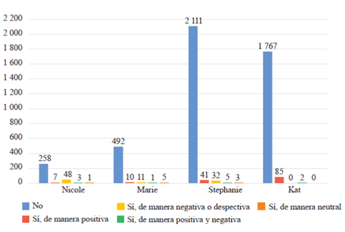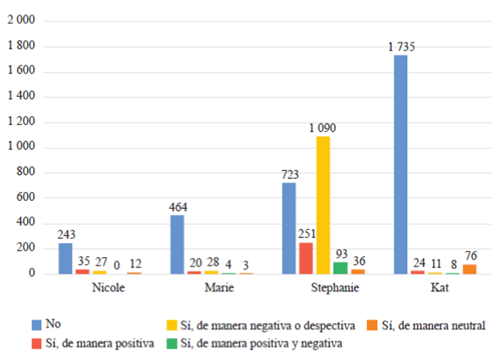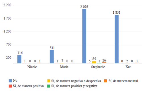 En este sentido, hubo 838 comentarios negativos, mientras que positivos son solo 200, y 10 neutrales. El 94.27 % de los comentarios negativos se dirigieron a Stephanie (F = 790). En positivos hubo más balance, pues el 53 % (F = 106) fueron hacia Stephanie, mientras que 40.5 % (F = 81) hacia Kat.