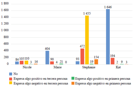 Ahora, en cuanto a la demostración de una interacción parasocial, pudimos ver que la mayoría de las expresiones fueron en tercera persona y no en primera. Es decir, fueron comentarios donde hablaban de los personajes como alguien en su vida cotidiana, pero no dirigiéndose a ellas directamente, como se ilustra en la Tabla 2. Los comentarios positivos fueron 861, mientras que los negativos, 1 571. Los positivos tuvieron una buena participación para todas las protagonistas, como se observa en la Figura 5. Nuevamente, la mayoría es para Stephanie con el 54.81 % de los comentarios, al igual que los negativos, que representan el 92.61 %.