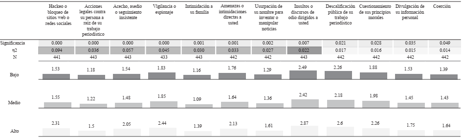 Asimismo, hay otras seis agresiones que victimizan recurrentemente a los altos mandos y también presentaron diferencias estadísticamente significativas respecto de rango medio y bajo y con tamaños de efecto moderado: el acecho, asedio o seguimiento insistente (p = < .001, η2 = .057); la vigilancia o espionaje (p = < .001, η2 = .045); las acciones legales a raíz del trabajo periodístico (p = < .000, η2 = .036); las amenazas o intimidaciones directas (p = <.001, η2 = .033); la intimidación a la familia (p = <.000, η2 = .030), y la usurpación de su nombre para manipular noticias (p = < 0.005, η2 = .027).