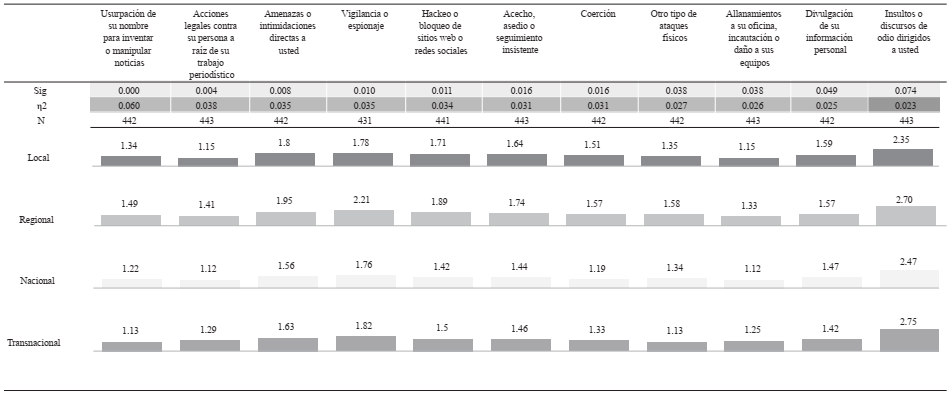 La agresión que más afectó a los periodistas de medios regionales (p = < .001, η2 = .060) fue la de usurpación del nombre para manipular noticias. Le siguen con menor tamaño de efecto y significación estadística el sufrir acciones legales contra su persona (p = < .01, η2 = .038); vigilancia o espionaje (p = <.01, η2 = .035), y amenazas o intimidaciones directas (p = <.01, η2 = .035). Posteriormente, también afectan más a periodistas regionales el padecer hackeo o bloqueo de sitios web (p = < 0.05, η2 = .034); acecho o asedio (p = <.05, η2 = .031); coerción (p = <.05, η2 = .031); otro tipo de ataques físicos (p = < .05, η2 = .027); allanamiento e incautación (p = <.05, η2 = .026), y divulgación de información personal (p = <.05, η2 = .025). Solo en el caso de esta última agresión los promedios de recurrencia han sido similares.