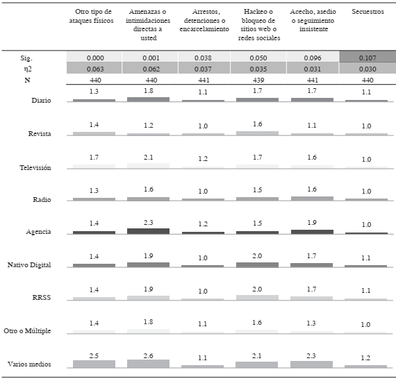 Fuente: Elaboración propia con base en las medias, análisis de varianza y tamaño de efecto (η2) para frecuencia de agresiones (1 = Nunca, 2 = Rara vez 3 = Algunas veces, 4 = Con frecuencia, 5 = Muy frecuentemente) y la pregunta ¿Cómo describiría la actividad central de su principal empleador, o el medio para el que trabaja con mayor dedicación? 1 = Diario, 2 = Revista, 3 = tv, 4 = Radio, 5 = Agencia de noticias, 6 = Nativo digital, 7 = Redes sociodigitales, 8 = Otro (multimedia), 9 = Varios medios y soportes. Valores de significancia al p = <.001, p = <.01 y p = <.05.