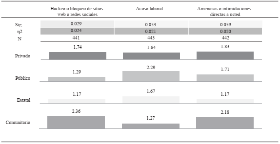 Fuente: Elaboración propia con base en las medias, análisis de varianza y tamaño de efecto (η2) para frecuencia de agresiones (1 = Nunca, 2 = Rara vez, 3 = Algunas veces, 4 = Con frecuencia, 5 = Muy frecuentemente) y la variable Tipo de propiedad del medio principal en el que se desempeña: 1 = Privado, 2 = Público, 3 = Estatal, 4 = Comunitario, 5 = Otro. Valores de significancia al p = <.001, p = <.01 y p = <.05.