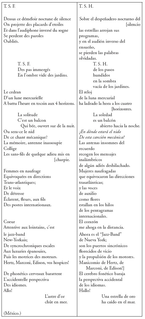 Las referencias cruzadas entre Maples Arce y Malespine se concretan con el intercambio de colaboraciones: éste colabora con un texto en la tercera entrega de Irradiador, junto con otros de José Juan Tablada, Kyn-Taniya, Polo-As y Gastón Dinner. Aquél, por su parte, tradujo su poema "T. S. H." al francés y lo envió a Malespine, en respuesta al guiño expresado en la reseña de Andamios interiores. Reproduzco, a continuación, "T. S. F.", publicado en Manomètre, núm. 4, de agosto de 1923,3 y luego la versión de Poemas interdictos (1927), a su vez recogida en Las semillas del tiempo. Obra poética 1919-1980 (1981). En ambos casos, "T. S. F." pierde el subtítulo de "(Poema de la radiofonía)", como lo recordaba la crónica del 9 de mayo de 1923. Habría que investigar con más profundidad si el poema leído por Maples Arce el 8 de mayo de 1923 formaba parte de Margen, poemario que al parecer no llegó a publicarse y que se anunciaba en Irradiador como la "sorpresa literaria del año".