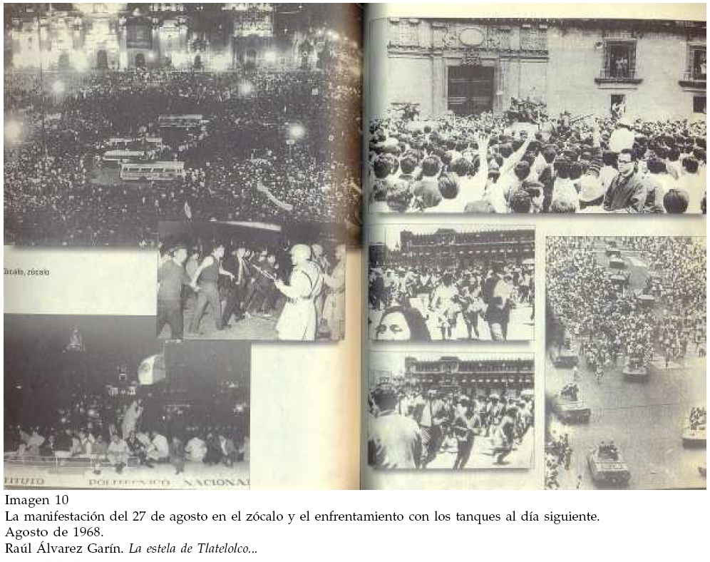 La gesta de la manifestación del 27 de agosto en el zócalo metropolitano, la más grande de todo el Movimiento y de la historia del país en su momento, y la secuela de la represión y el acoso militar a la población en el mismo sitio en la mañana del día siguiente representa un buen ejemplo del planteamiento anterior (Imagen 10).