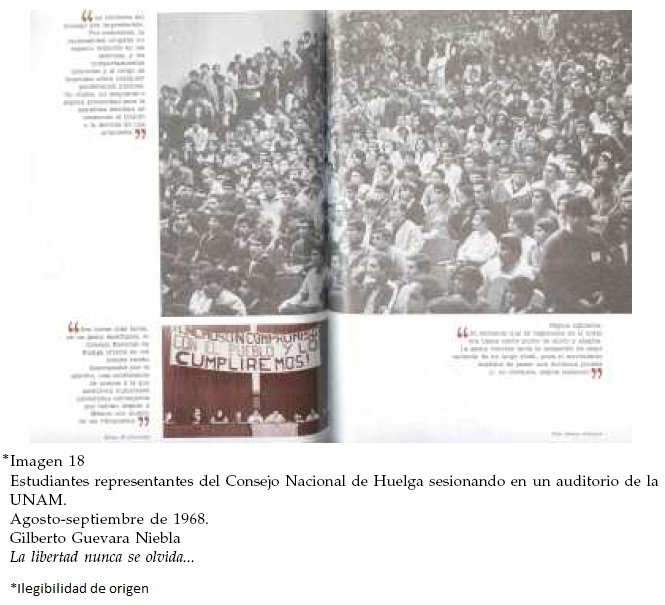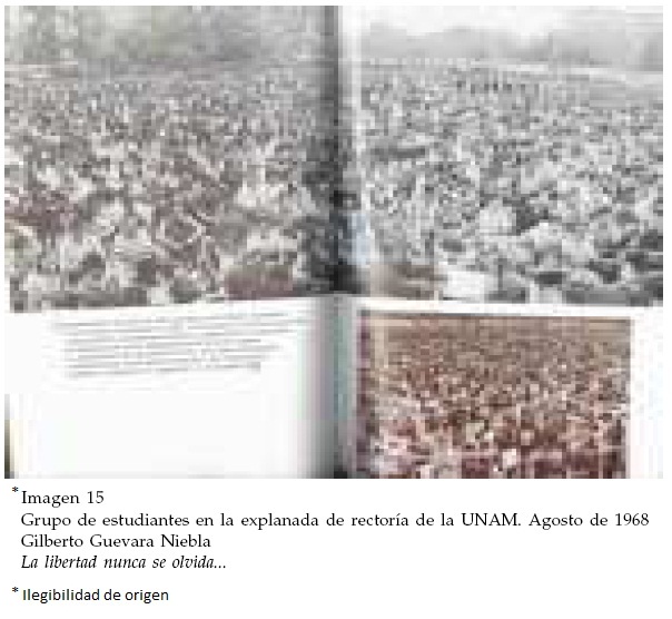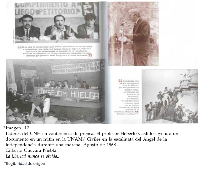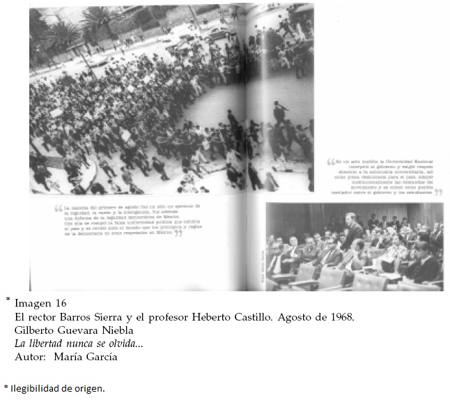 El pie enfatiza lo anterior, caracterizando la marcha del rector como parte de una protesta que reivindicaba la defensa de la legalidad democrática y que permitió la ruptura pública de una percepción de uniformidad política en el país. La fotografía del Ingeniero Castillo lo muestra durante una intervención en el Consejo Universitario, al lado de otros investigadores que lo observan con atención y respeto. Una abrumadora mayoría masculina porta sus trajes y delgadas corbatas, mientras que una sola mujer permanece sentada casi en el centro del pequeño auditorio. El pie rescata el carácter "insólito" del apoyo de profesores y autoridades universitarias, que adopta las demandas estudiantiles, reivindica la autonomía y se coloca como posible mediador entre el gobierno y los estudiantes. De acuerdo al relato de Guevara, ambos personajes desempeñaron un papel estratégico para la construcción de una legitimidad y una voluntad democrática en el Movimiento. El pequeño dossier fotográfico del libro también destaca la importancia de estas dos figuras y subraya su participación por encima de otros personajes cercanos a los estudiantes.31