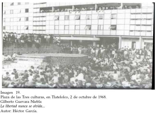 El final del portafolio está representado por una de las fotografías más conocidas de Héctor García, que capta a una parte de la multitud estudiantil en el mitin de Tlatelolco (Imagen núm. 19). En la composición de la imagen ocupa un lugar importante la coexistencia de las ruinas prehispánicas con la fachada del edificio "Chihuahua", lo que ubica el lugar de los acontecimientos y resalta la densidad histórica de la Plaza de las Tres culturas. Una parte de los estudiantes escuchan tranquilos y de pie al orador del momento. En un primer plano puede observarse a otro grupo que descansa plácidamente sentada en la explanada y que conversa en pequeños grupos o se acuesta con los brazos extendidos. El ambiente es bastante relajado. El pie enfatiza este aspecto y destaca que la atmósfera en que se registraba el mitin era de tranquilidad, alivio y alegría.