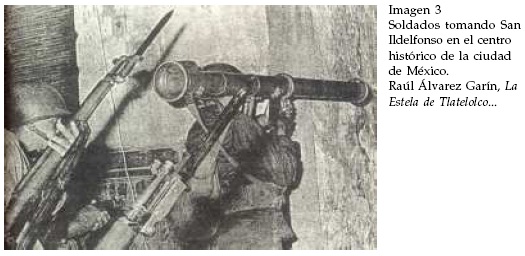 En términos generales, policías, granaderos y ejército constituyen cuerpos anónimos que no muestran la personalidad concreta de sus integrantes y que son captados por detrás o parcialmente ocultos en sus cascos. La fotografía que da inicio al dossier y que muestra a un par de soldados en la toma de San Ildefonso con la tristemente célebre bazuca que hizo famoso el episodio representa una muestra al respecto. (Imagen 3).