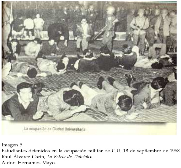 Otro caso significativo es el de los estudiantes detenidos durante el operativo militar de ocupación de la Ciudad Universitaria la noche del 18 de septiembre. Los estudiantes acostados en fila boca arriba y boca abajo son custodiados por los soldados. Uno de los jóvenes que aparece en primer plano hace contacto visual con el fotógrafo y le dirige una significativa sonrisa (Imagen 5).