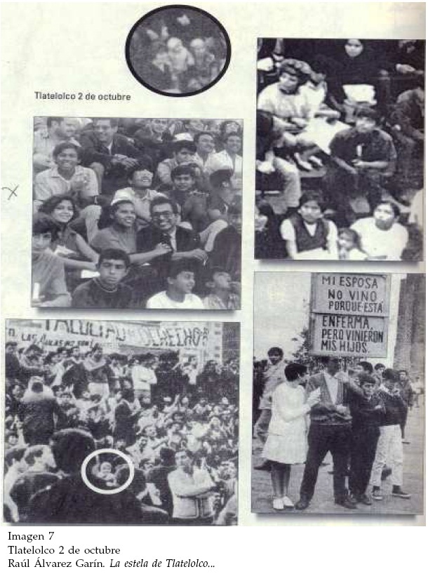 Un tercer caso representativo lo encontramos en la matanza del 2 de octubre. Una plana entera muestra distintos aspectos del mitin. Sobresale la figura de un bebé encerrado en un círculo, lo que subraya la intención del editor de mostrar una escena familiar que denota el carácter pacífico del evento; una pareja de jóvenes sonrientes se toman los brazos y un padre de familia rodeado de sus hijos porta un significativo cartel que dice: "Mi esposa no vino porque está enferma, pero vinieron mis hijos" (Imagen 7).