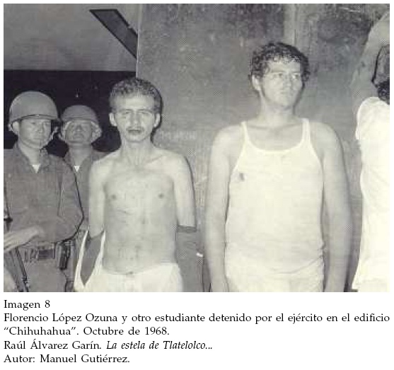 Otro de los casos más importantes que ilustra este rubro que destaca la identidad de las víctimas está representado por una fotografía que muestra a dos jóvenes detenidos en calzoncillos y semidesnudos. El de la izquierda es el líder estudiantil Florencio López Osuna, que mira al fotógrafo con la cara deformada por los golpes y un gesto de desencanto y preocupación (Imagen 8).13