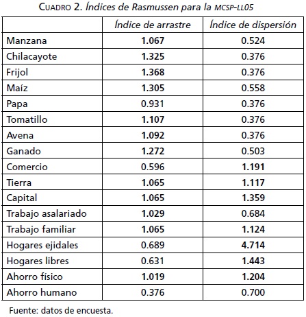 Por otra parte, podemos observar que las cuentas con un índice de arrastre superior a la unidad son cuentas del sector agropecuario, mientras que aquellas con un índice de dispersión mayor que 1, son las cuentas del comercio y de los hogares, lo cual indica que la estructura de esta economía es una en donde el sector agropecuario utiliza mayormente insumos del propio ejido, y que un incremento en la demanda de los mismos (a partir de programas de comercialización, por ejemplo) tendría importantes efectos multiplicativos sobre la economía del lugar. Aunque sería de interés realizar un análisis comparativo con base en estos indicadores, desafortunadamente hasta donde sabemos este tipo específico de análisis no se ha llevado a cabo para otros ejidos de México.