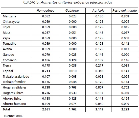 La inspección de la MMG nos permite observar cuatro cuentas de la MMG con un efecto multiplicador superior a tres: frijol ($3.64), chilacayote ($3.526), maíz ($3.472), y ganado ($3.384). Por otra parte, las cuentas con el menor efecto multiplicador son: hogares ejidales ($1.832), hogares libres ($1.678), comercio ($1.586) y ahorro humano ($1.00). Valga recordar que el ahorro humano se refiere a los gastos educativos, cuya totalidad se entrega al gobierno, por lo cual esa cuenta no tiene relación alguna con las cuentas endógenas.