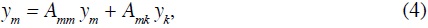 donde ym y yk son los vectores (columna) de renta de las instituciones endógenas y exógenas respectivamente, Amm y Amk , las submatrices de orden mxm y mxk respectivamente, obtenidas al particionar la matriz de coeficientes de gasto Ann de acuerdo con la clasificación de instituciones endógenas y exógenas adoptada, como sigue: