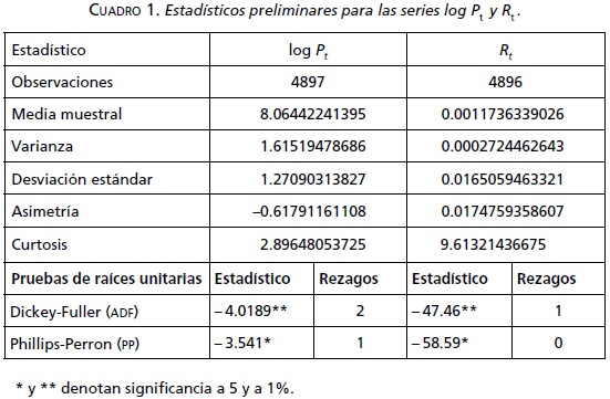 donde T es el número de observaciones, el término de perturbación es tal que E(ut) = 0, y prueba la hipótesis nula de α1 = 1.1 Si a = 1, entonces una raíz unitaria está presente en la serie. El cuadro 1 reporta las pruebas para las series log Pt y logaritmo de la primera diferencia Rt. Los resultados de la prueba ADF no indican la presencia de una raíz unitaria en el logaritmo de Pt en ambos niveles de significancia, mientras que la prueba pp rechaza la presencia de una raíz unitaria en el nivel de 1%, mas no a 5% de significancia en dicha serie. Tanto la prueba ADF como la pp para el log Pt se realizaron incorporando una tendencia e intercepto, el cual en ambos casos resultó significativo, mientras que las mismas pruebas para los rendimientos sólo incorporaron un intercepto.