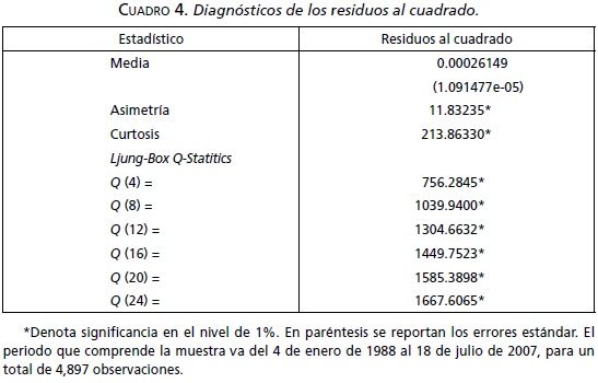 Los resultados del diagnóstico muestran que los valores del estadístico Q-Ljung-Box del modelo GARCH (1,1) resultaron no significativos en los niveles convencionales, con excepción del LB (4), que es significativo a 5% pero no a 1%; de aquí es posible concluir que los residuos al cuadrado estandarizados no están serialmente correlacionados y que por tanto el modelo ajusta adecuadamente la volatilidad de los rendimientos del IPC.