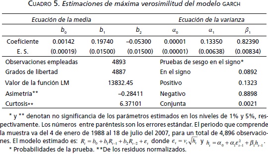 Los resultados de las estimaciones para el modelo GARCH (1,1) se presentan en el cuadro 5: