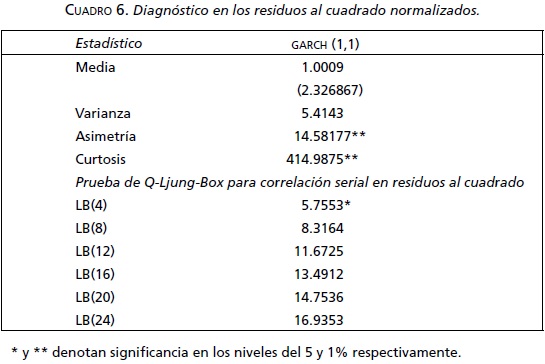 Con la finalidad de evaluar el ajuste y la capacidad de los modelos para modelar la varianza, en el cuadro 6 se presenta un diagnóstico de los residuos al cuadrado normalizados: