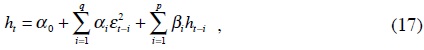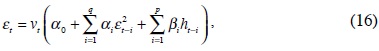 La varianza del modelo puede ser dependiente del tiempo y expresar se como una función de realizaciones pasadas. Bollerslev (1983) generalizó la metodología ARCH que Engle (1982) introdujo en la bibliografía econométrica. Este tipo de modelo fue encontrado extremadamente útil (Chou, 1988 y French et al., 1987) en economía y finanzas debido a su gran flexibilidad en la modelación de su segundo momento. Si el término del proceso de error es: