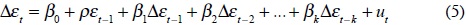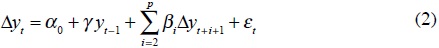 donde εt son los residuos de la ecuación cointegrante, establecida en (4), y ut son los residuos de la prueba de la raíz unitaria ADF, los cuales se asumen como ruido blanco.