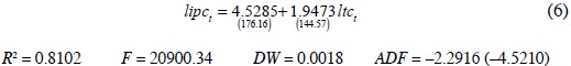 El valor del estadístico Dickey-Fuller resultó ser de -2.2916, muy por debajo en valor absoluto del valor crítico de 95% de confianza, lo cual sugiere que ambas series no cointegran; la prueba se especificó sin intercepto y el número de rezagos se eligió de acuerdo con la metodología de lo general a lo particular. Sin embargo, una de las principales limitaciones del método de Engle y Granger para probar cointegración es que asume que el modelo estimado está correctamente especificado, de tal manera que la dirección de la causalidad implícita entre las variables es la correcta.