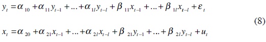 No obstante lo anterior, se llevó a cabo la prueba de causalidad en el sentido de Granger, la cual consiste en estimar un VAR de la forma: