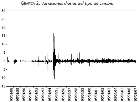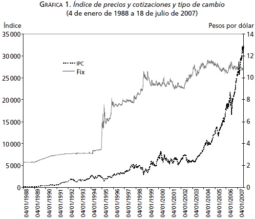 Dado lo anterior, planteamos las siguientes preguntas: i) ¿el mercado accionario reacciona de forma inmediata a las depreciaciones del tipo de cambio?, si fuera el caso, ii) ¿reaccionan de la misma forma los rendimientos y su volatilidad ante las depreciaciones cambiarias de distinta magnitud, o bien lo hacen de forma asimétrica? Para responder estas interrogantes empleamos información histórica diaria de ambas variables para el periodo que comprende del 4 de enero de 1988 al 18 de julio de 2007.