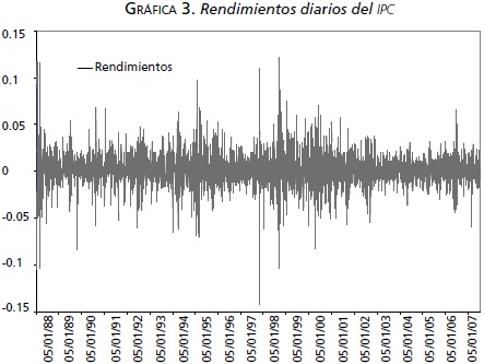 Las gráficas 2 y 3 muestran las variaciones diarias porcentuales del tipo de cambio y los rendimientos diarios del IPC, respectivamente. Como se puede apreciar en la gráfica 3, la varianza de los rendimientos no es constante a lo largo del tiempo, sugiriendo que su modelación tome en cuenta alguna forma de heterocedasticidad autorregresiva.