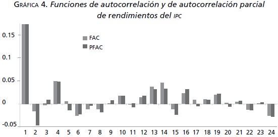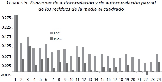 El correlograma de los coeficientes de autocorrelación (FAC) y de autocorrelación parcial (FACP ) de los residuos al cuadrado del modelo AR (2) se presenta en la gráfica 5. El estadístico Q de Ljung-Box también se calculó para los residuales al cuadrado; el cuadro 4 reporta los valores de la prueba del estadístico Q hasta 24 rezagos. El estadístico Q está dado por: