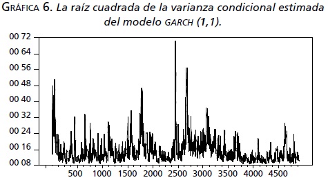 La gráfica 6 muestra la raíz cuadrada de la varianza condicional estimada del modelo GARCH (1,1):