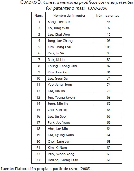 En el caso de los IP coreanos, los primeros 23 nombres de la lista (cuadro 3) mostraron un patrón de registro de patentes más trascendente (61 o más). Estos IP son más productivos en conocimiento; en comparación con los IP en patentes mexicanas representan 8.26% del total de inventores registrados (66 271) de Corea y acumulan un total de 1 884 patentes (4.19% del total de patentes otorgadas).