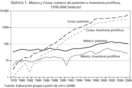 Las tendencias registradas en el periodo 1978-2006 resultan apreciables: los flujos de patentes de México crecen a una tasa promedio de 4.15% anual, en tanto que la producción de conocimiento de Corea, medida en patentes, crece a un promedio anual de 31.20%. "El sistema de patentes de Corea está caracterizado por un conjunto de incentivos que apoyan la difusión de la innovación y la protección de capacidades tecnológicas alcanzadas durante el periodo de industrialización" (Aboites y Cimoli, 2002), lo que no se verifica en el caso mexicano.
