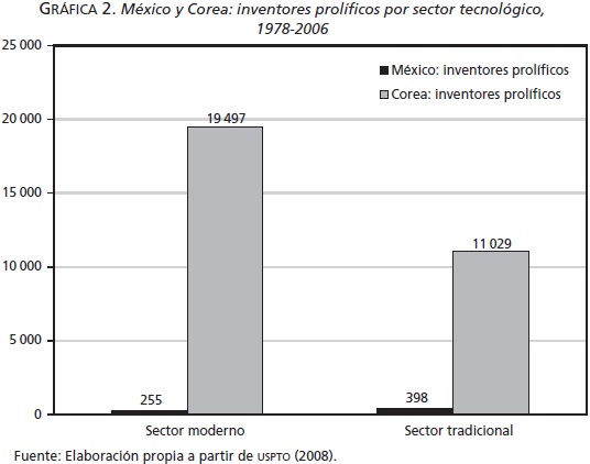 La información recopilada por medio de la USPTO (1978-2006) fue de 1 908 patentes con al menos un inventor mexicano y 45 022 patentes con al menos un inventor coreano (véase cuadro 1 y anexo 2).