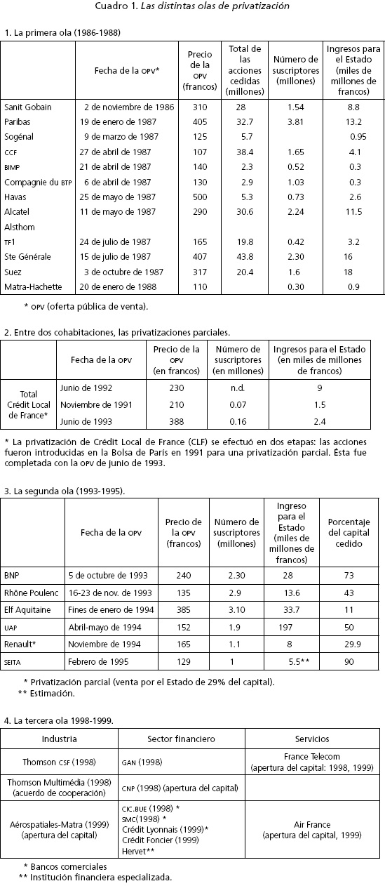Finalmente, además de su impacto propiamente económico, hay que agregar que las privatizaciones de los grandes orgullos tradicionales de la industria o de la banca o del sector de las aseguradoras (véase la larga lista de las privatizaciones en el cuadro 1) fueron también la oportunidad para comenzar a dar forma a ese capitalismo de "asalariados accionistas", vieja tentación de los poderes públicos sucesivos. Al ofrecer a los asalariados de las antiguas empresas públicas accesos preferenciales a los títulos patrimoniales de las empresas recién privatizadas, se creó un fuerte incentivo para el desarrollo de un estrato de accionistas asalariados. El estímulo fue eficaz pues por primera vez en Francia millones de asalariados adquirieron (en muy pequeñas cantidades, es cierto) títulos patrimoniales. Esta mutación también reviste una dimensión cualitativa decisiva.
