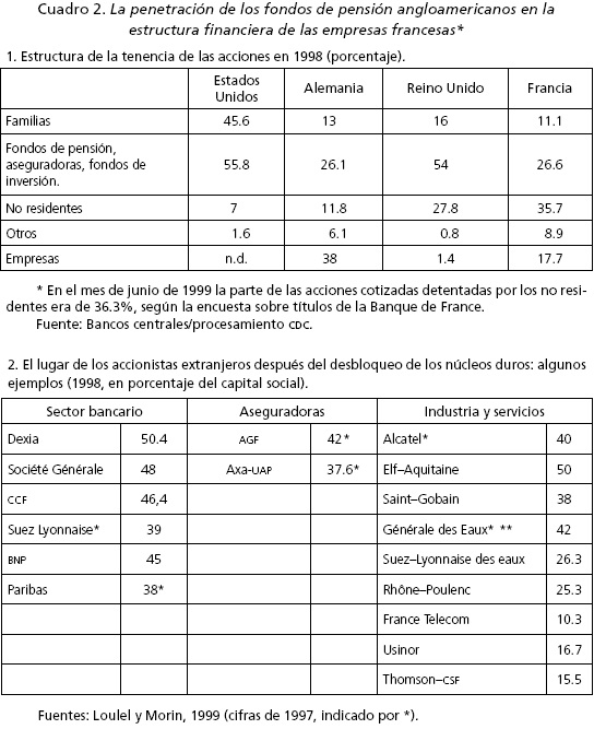 Resultado de estas mutaciones: el total de los títulos patrimoniales controlados por los fondos de pensión angloamericanos rebasa en promedio 50% el total de las acciones que corresponden a participaciones cruzadas entre accionistas nacionales (cf. cuadro 2). Pero, sobre todo, Francia se encuentra de pronto con la tasa de penetración de inversionistas extranjeros más elevada de todos los grandes países industriales. Así, podemos sonreír por la paradoja cuando con motivo de tal o cual OPA que suscita en Francia un poco de emoción, vuelan las protestas de los inversionistas institucionales en contra de la famosa "timidez" francesa. Ya en la época del fordismo era posible afirmar que "Francia era el mejor alumno de Taylor y de Ford".17
