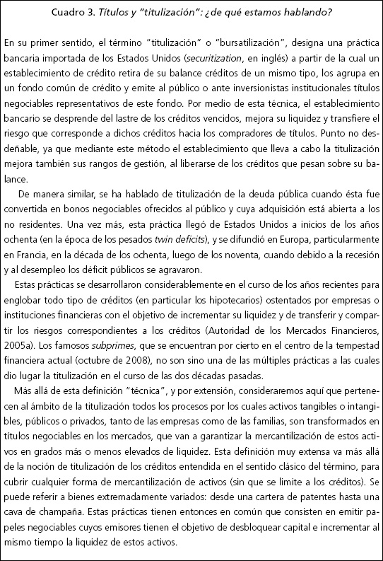 Si designamos estos cambios por su concepto, podríamos decir que estamos ante una mutación continua, que avanza acelerada y bruscamente: la "titulización" de los valores económicos. Es ella la que constituye a la vez el soporte y el vector clave de la transformación de las formas sociales que estamos presenciando. Precisemos que entendemos aquí la noción de titulización en un sentido amplio. Más allá del significado técnico que le fue atribuido inicialmente, designamos con este término el conjunto de los procesos por medio de los cuales valores, deudas y patrimonios son representados en títulos negociables cuyas cotizaciones están determinadas por los mercados, se trate de mercados financieros organizados y regulados o, más a menudo y prosaicamente, de mercados no organizados, los mercados OTC (over the counter), más rústicos y menos líquidos, llevados por bancos o establecimientos especializados de diversa índole, en una infinita variedad de títulos (cf. cuadro 3).