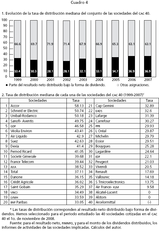La distribución de los dividendos entre los accionistas un indicador clave de la "financiación" de las empresas conoce en Francia un auge notorio. En efecto, aunque la tasa mediana para el conjunto de las empresas del CAC se situó en un nivel que es alto aunque todavía mesurado (36.9% en 2007, pero en aumento continuo desde 2002, después de la reactivación que siguió a la crisis de 2001) esta media oculta variaciones sumamente importantes. Es así como, si consideramos las 10 primeras empresas, las tasas de distribución de los dividendos son extraordinariamente altas y se sitúan entre 40 y 60% (desde 41.05% para Pernod Ricard hasta 58.13% para Accor). La tasa media (36.9%) se explica entonces por el hecho de que si consideramos las 10 últimas empresas, varias compañías del CAC no distribuyeron dividendos al haber sufrido pérdidas importantes en el curso de varios años (el caso en particular de Alcatel y de Alstom). El detalle de las tasas de distribución es presentado en el cuadro 4.