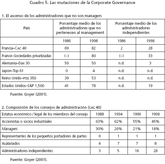 Incluso si se trata de una evolución muy "silenciosa", los datos compilados por Goyer (2001) y presentados en el cuadro 5, muestran la importancia de los cambios ocurridos en el corporate governance de las empresas del CAC en los años que siguieron a las privatizaciones.