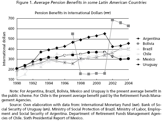 The average pension benefit in Argentina and Uruguay collapsed after the Argentinean peso crisis of 1999-2002. The average benefit in Uruguay does not include those pensions in the independent pension fund trusts (cajas de pensiones). The workers in these fund trusts may have higher education and enjoy larger benefits, which may increase the Uruguayan average benefit and make it close or exceed the Chilean average. On the other hand, México's PAYGO pension benefits are high and well above the fully funded benefit paid in Chile.