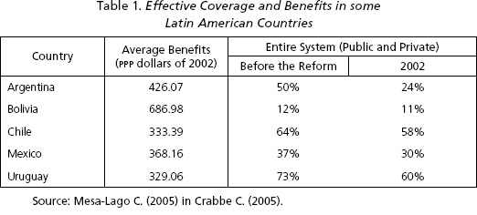 In order to understand the rationale for participation in the new pension scheme we must observe the level of effective contribution.5 The evidence from different sources shows that, after the reforms effective contribution in the pension system has not increased. Table 1 gathers information mainly from Mesa-Lago (2001) on effective coverage before and after the reforms in some Latin American countries.