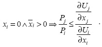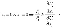 Sin embargo, Walras (1874-1877 [1965], lección 12, p. 294) advierte que la posibilidad de que un individuo encuentre ventajoso ofrecer toda la cantidad de uno de los bienes que posee en su dotación inicial (xi = 0 ∧ x̅i > 0), o bien el caso extremo, que implica una demanda absolutamente nula del otro bien (xi = 0 ∧ x̅i = 0). En el primer caso, el poseedor de uno de los dos bienes de la economía ofrecerá toda su dotación, siempre que el precio del bien demandado en el intercambio sea menor o igual que la razón de las utilidades marginales: