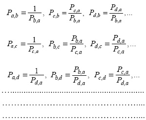 Así, por ejemplo, en el caso de una economía de tres bienes (A, B, C), el agente poseedor del bien A conocerá los precios relativos Pa,b, Pa,c, pero desconocerá el precio relativo Pb,c , que se establece en un mercado donde dicho agente no participa. Se supone que para los intercambios entre bienes existe una división en tantos mercados como pares de bienes se intercambian. Es decir, que existen