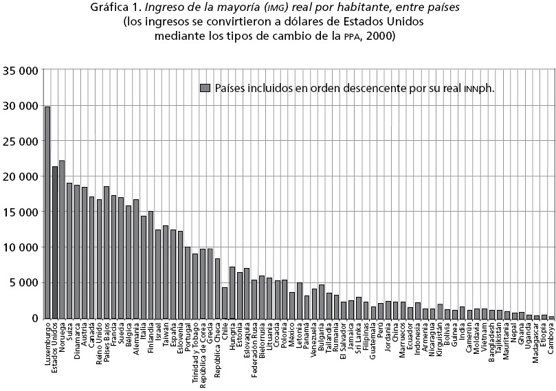 La gráfica 1 muestra que los ingresos reales KM en 2000 comprenden un amplio rango: en cifras redondeadas, hacia un extremo de la escala se encuentra Luxemburgo (30 000 dólares), Noruega (22 000 dólares) y Estados Unidos (21 000 dólares). En el otro extremo se encuentran Etiopía (500 dólares) y Camboya (300 dólares). En este cuadro los países están clasificados de mayor a menor de acuerdo con su ingreso nacional neto por habitante (INNph);2 se observa que Luxemburgo está en primer lugar, Estados Unidos en segundo, Noruega en tercero y así sucesivamente.