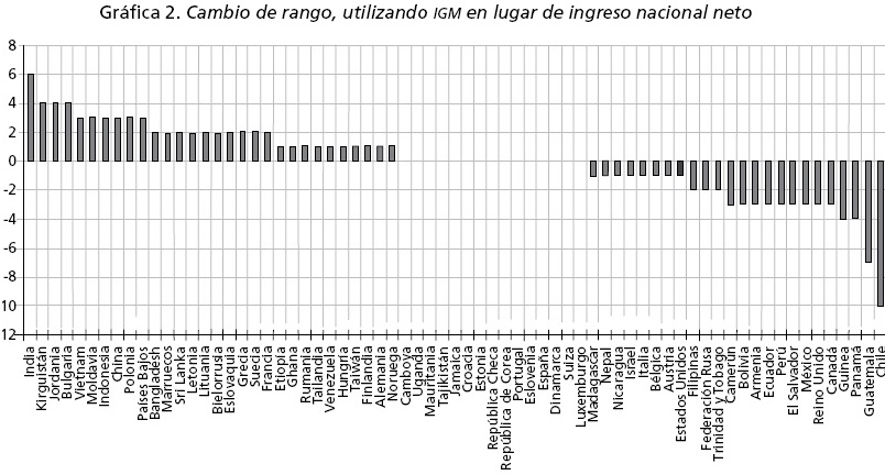 El cuadro 1 muestra el IGM, el ingreso nacional neto por habitante y una medida del ingreso por habitante relativo del 20% más rico de la población, a la cual denominamos el ingreso de la minoría opulenta (IMO). También se presenta el ranking de los países de acuerdo con el ingreso nacional neto por habitante y el correspondiente al IGM, así como la diferencia entre ambos, la cual se registra en la última columna. Los países se han enumerado de acuerdo con esta diferencia. Se puede observar que India aparece en el lugar más alto de la lista debido a que asciende seis lugares; Jordania y Bulgaria ascienden cuatro lugares, cada uno, mientras que Vietnam, Países Bajos y China ascienden cada uno tres lugares. En el otro extremo, México, Reino Unido y Canadá descienden cada uno tres lugares.3 Por otra parte, Panamá desciende cuatro lugares, Guatemala desciende siete en tanto Chile aparece al final de la lista, cayendo 10 lugares.