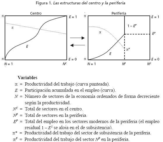 En el centro, la inclinación de la curva de productividad es pequeña; por tanto, también es pequeña la diferencia entre los sectores de mayor (N = 1) y de menor productividad (N = NC). Lo opuesto ocurre en la periferia, donde la productividad decrece muy rápidamente entre un sector y otro. Pero, además, en la periferia el progreso técnico penetra en unos pocos sectores: aquellos vinculados con la actividad exportadora. Por esa razón, el conjunto de sectores modernos es truncado en la periferia en un valor bajo de N, a partir del cual se abre un amplio escalón que separa su productividad de la productividad de los sectores de subsistencia. Obsérvese que hay sectores en la periferia cuya productividad es más alta que la del centro. Sin embargo, como la curva de productividad de la periferia decae a tasas crecientes y, además, los sectores modernos son incapaces de absorber todo el empleo, la productividad media de la periferia tenderá a ser mucho más baja que la del centro.