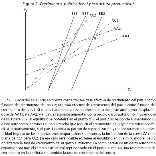 El primero de ellos es que la tasa de crecimiento de la periferia depende del crecimiento del gasto autónomo del centro, así como del esfuerzo periférico por desarrollar sus capacidades tecnológicas en comparación con la actividad innovadora del centro. Ello no significa que el gasto autónomo de la periferia no tenga importancia, ya que debe recordarse que el modelo supone que éste se eleva y cubre cualquier diferencia que surja entre el crecimiento efectivo y el crecimiento compatible con la restricción externa. En otras palabras, el modelo supone una política fiscal activa que pone en jaque cualquier sesgo mercantilista. La función del cambio estructural (y del aumento de la competitividad externa) es abrir espacios para la expansión fiscal sostenible, no el de sustituir un tipo de gasto por otro en el conjunto de la demanda agregada. Siendo así, la política fiscal garantiza una expansión del mercado interno compatible con el equilibrio externo, y que no sustituye ni se contrapone a este último.