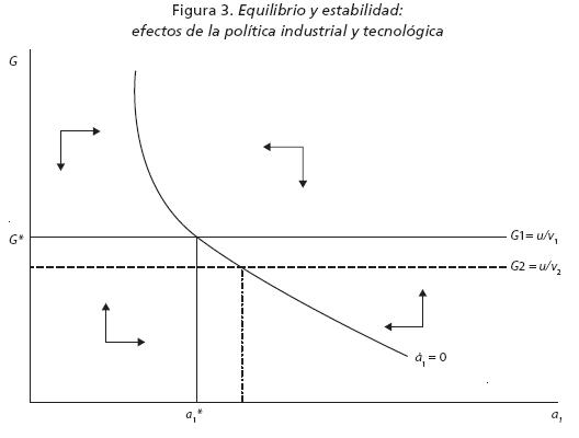 La figura 3 presenta el diagrama de fase del sistema formado por las ecuaciones (12) y (16). Se demuestra en el apéndice matemático que el sistema es estable. Como un ejercicio de dinámica comparativa, podemos analizar qué ocurre si la periferia aumenta sus esfuerzos de catchingup, elevando el parámetro v, de v1 a v2. Ello sería consecuencia, por ejemplo, de una política tecnológica más activa, que estimulara inversiones en ID y capital humano. El cambio de política induce otro en la estructura periférica, mejora su competitividad internacional y genera un nuevo equilibrio, con una brecha menor, más espacio para la política fiscal (aumenta α1) y, como corolario, una tasa de crecimiento más alta.